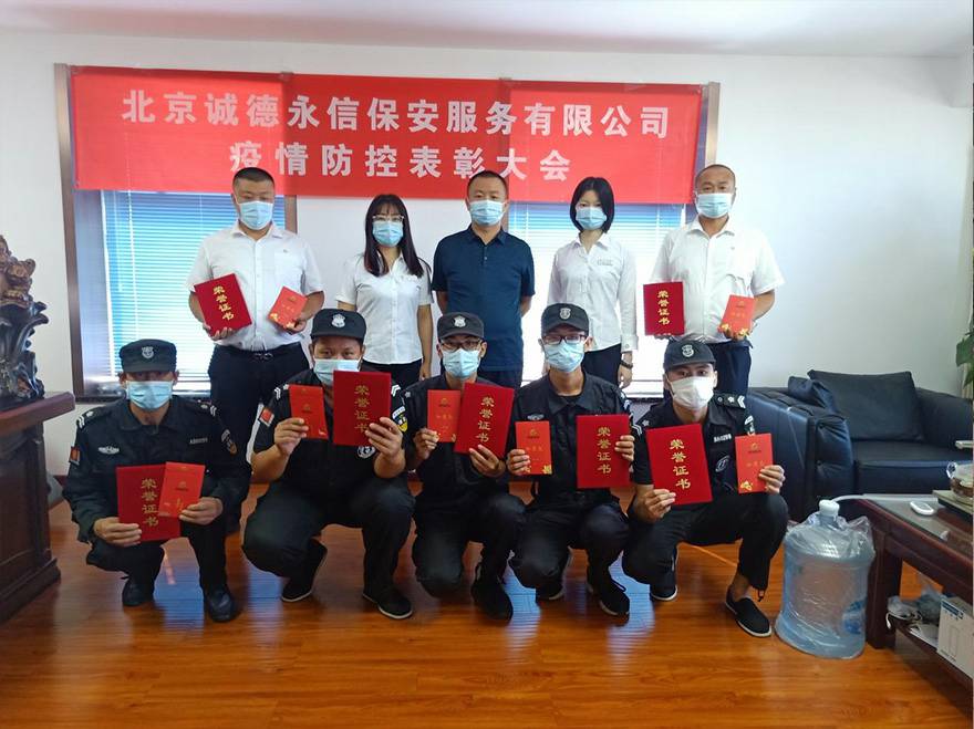 此次表彰大会,是我司对房山区阎村镇千禧家园抗疫工作的总结,同时表彰在抗疫期间的优秀员工并颁发证书和奖金。获奖人员分别为:郭宏宇、于龙、王立刚、李利景、时立辉、陈子阳及吴文平7位保安同志。受表彰的保安队长说:“作为社区防疫服务队员,面对疫情,责无旁贷,我是一名退伍军人,更应该挺在前面!”